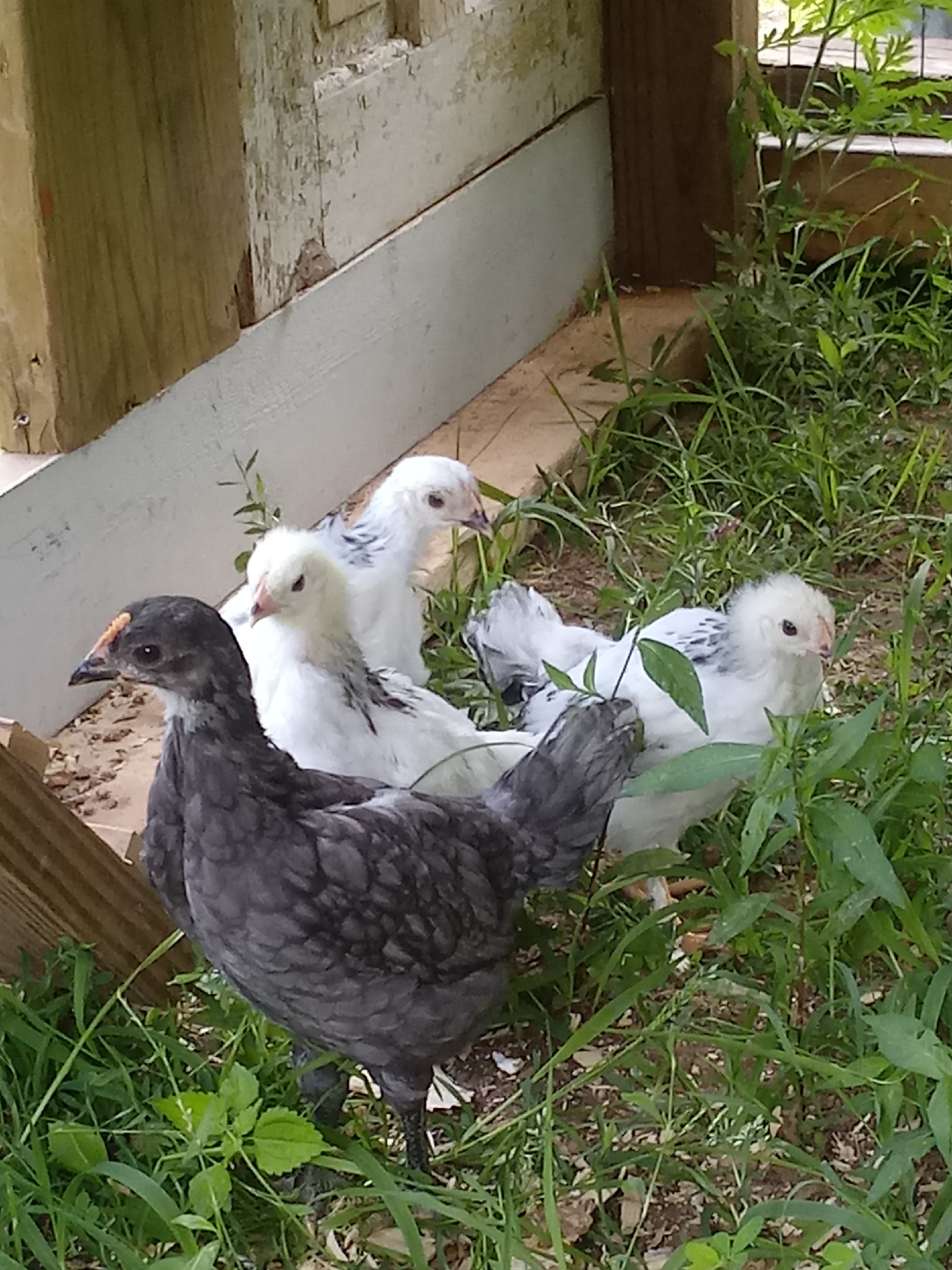 Then we waited and not a one went back up for the night! So I crawled underneath the coop and put each back up through the hole for the night! They will catch on! Everything is new!