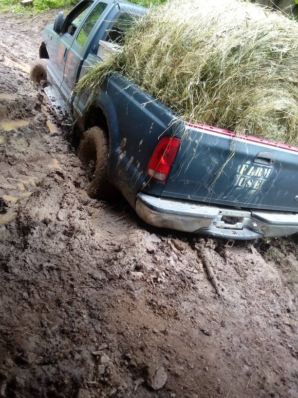 So moving on. The cows have eaten things down far more quickly than we’d have ever imagined. We have supplemented with hay and grain but now we were out of last years hay! So the mad dash for a big round bale of golden goodness ensues! A 45 minute trip one way and we have the goods! Now back to the farm we go! Problem!!! Our big 70 HP John Deere is at the other farm in waiting for the call that hay day has finally arrived! I have talked about the mud, even posted some pictures but until you are here in it, trying to work in it, or you yourself live this life, no justice can be done. So our Farm Truck was the only option! She’s a beater of a truck! Lucked into her and gave $350 for her and drove her home! A decal on her back glass has dubbed her, ” Bargain Betty “! But anyways! Once you get the momentum finally going, you don’t let off in the mud! Well babe made it, we are only missing a mirror that got taken off by the pass of the livestock chute! I call it a small price to pay and a win!